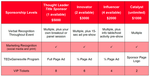 A list of the sponsor levels and the benefits of each are outlined below. Please contact Jennifer Phelps at info@tedxgnv.org for more info about In-Kind sponsorship.